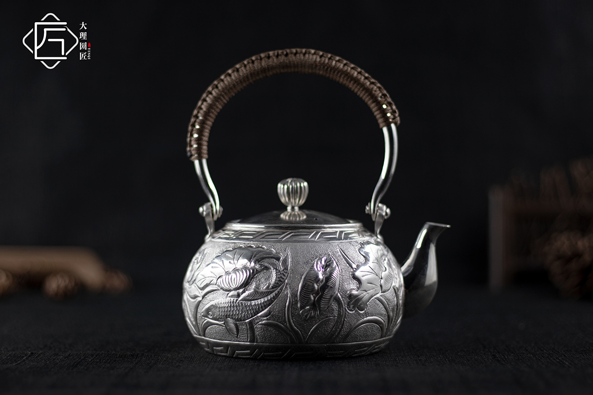 纹饰主要由锦鲤和莲花组成,寓意着年年有余,生活幸福美满。银壶谐音迎福,有着祝福的含义。